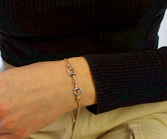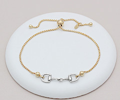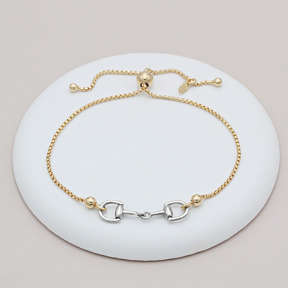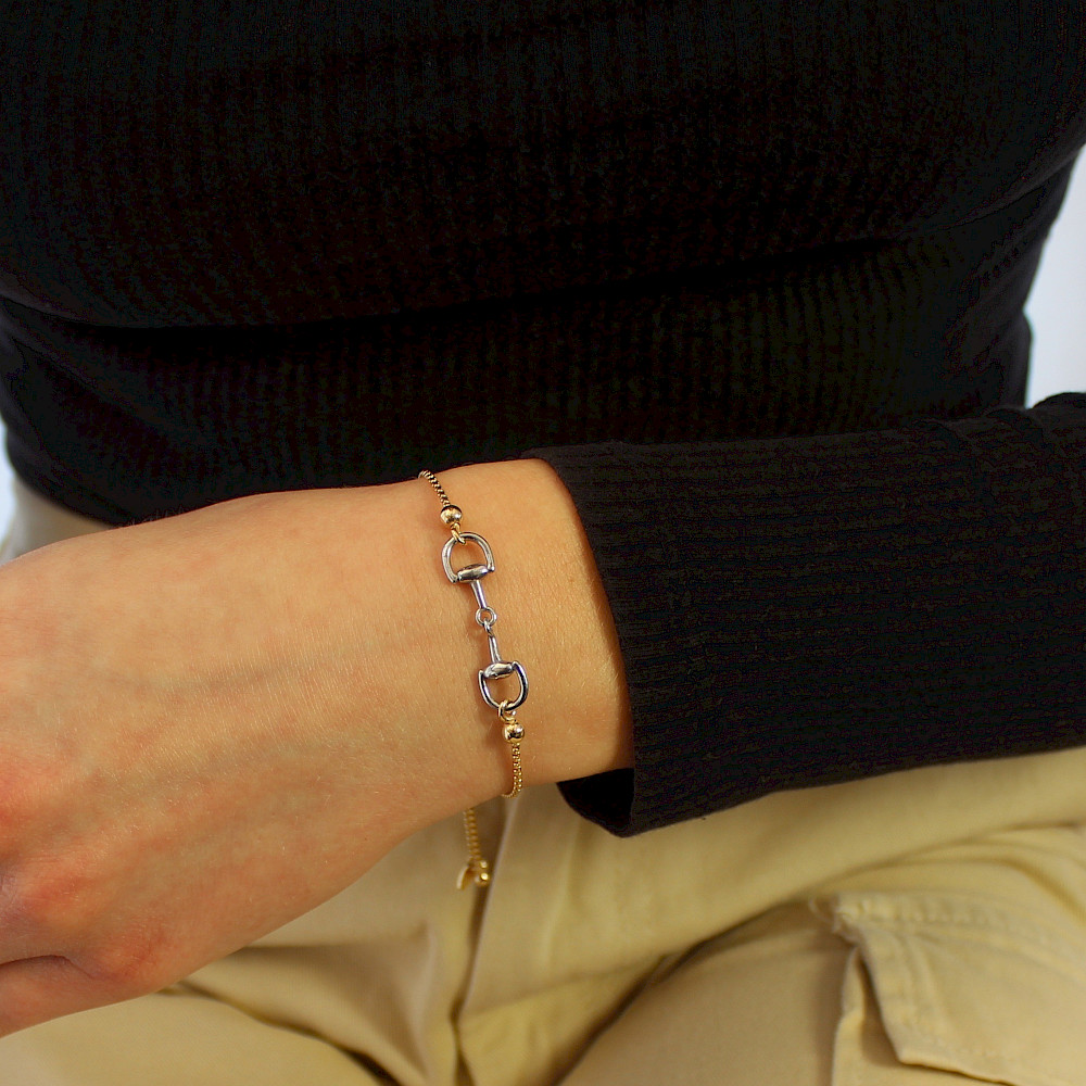 Dainty Sterling Silver double-sided Snaffle bracelet. It has an adjustable slider clasp making this cute little bracelet a perfect gift for a friend or loved one. Enhanced with 18ct Gold Vermeil this slider bracelet is sure to get all recipients smiling.