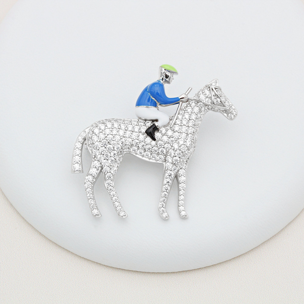 Beautifully crafted Racehorse and Jockey encrusted with dazzling Cubic Zirconias. The jockey is highly detailed with vibrant enamel in green, blue and white, giving life to the figure and adding contrast to the sparkling stones. This brooch would definitely appeal to the racing enthusiast and make the perfect accessory to your Ascot outfit!