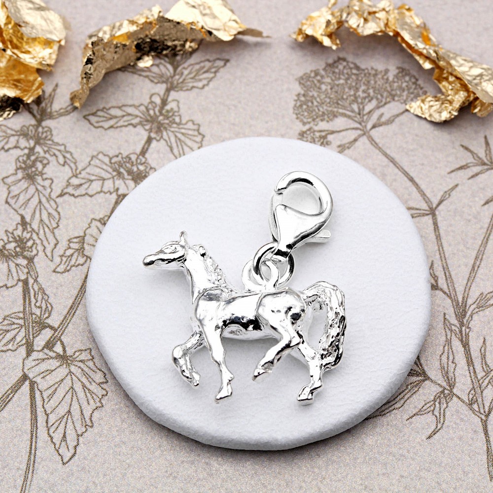 Very realistic Sterling Silver hook on Pony charm. It hooks on traditional charm bracelets, chains, or even your zip!