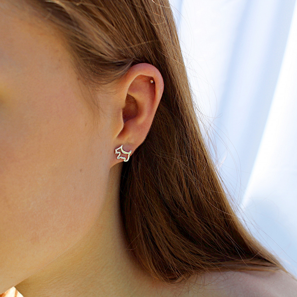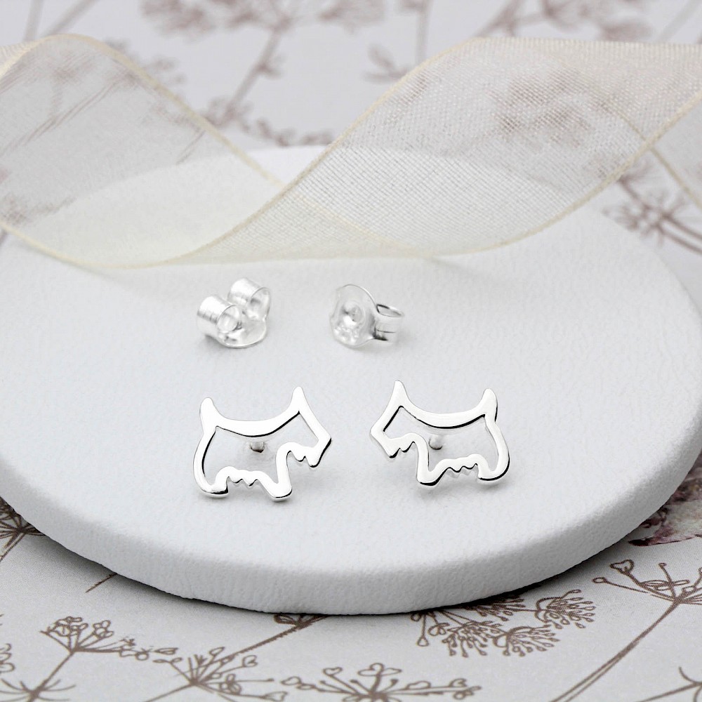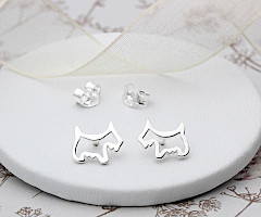 Dinky little Scottie Dog ear studs made from Sterling Silver are a perfect gift for all dog lovers. Cleverly cut into a silhouette and highly polished, the bright little Scotties are destined to be treasured. Matching necklace available.
