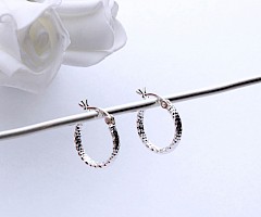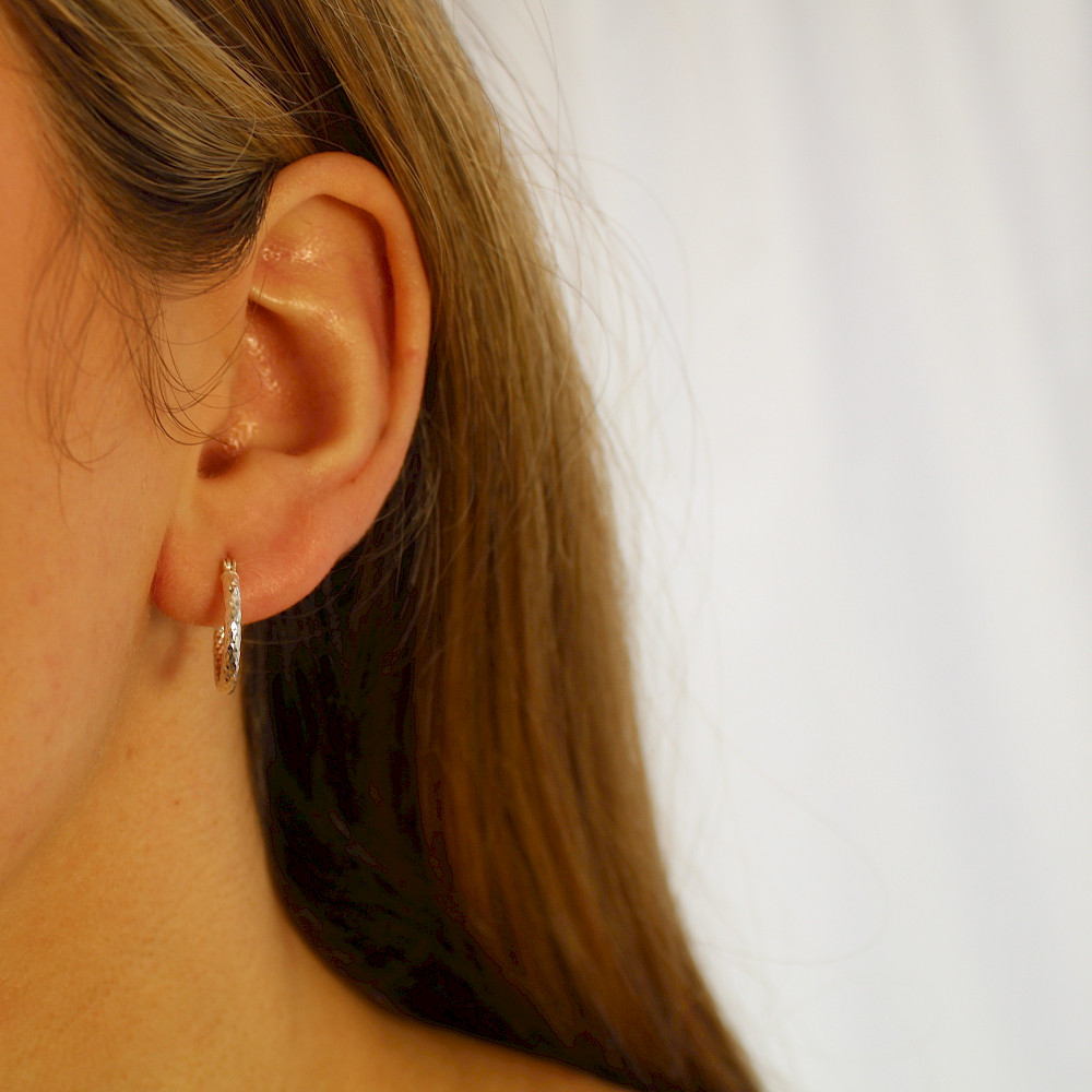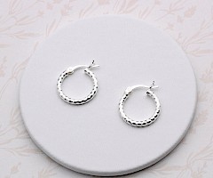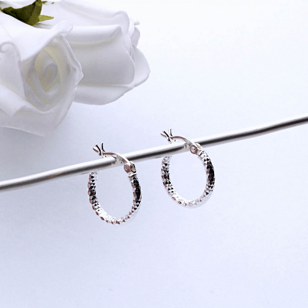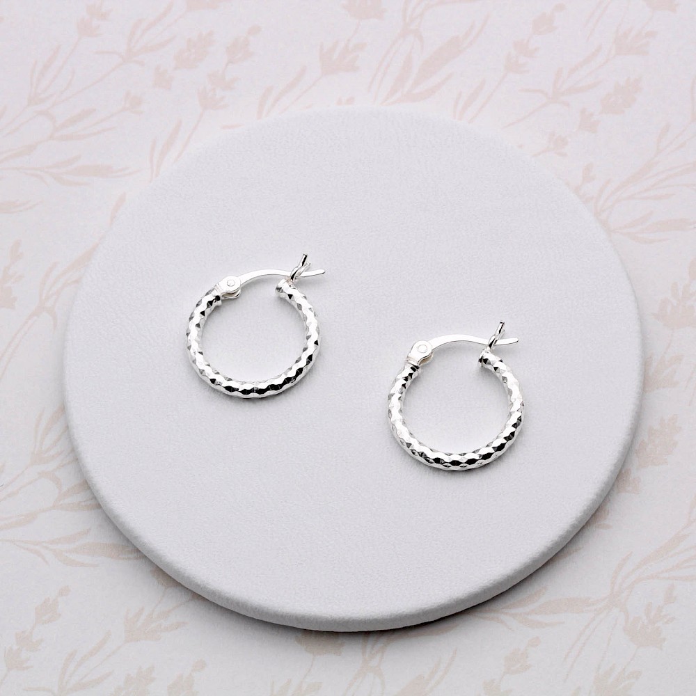 Small creole style round hoops crafted in Sterling Silver. These lovely earrings offer a little sparkle and glisten from the cleverly diamond-cut finish.