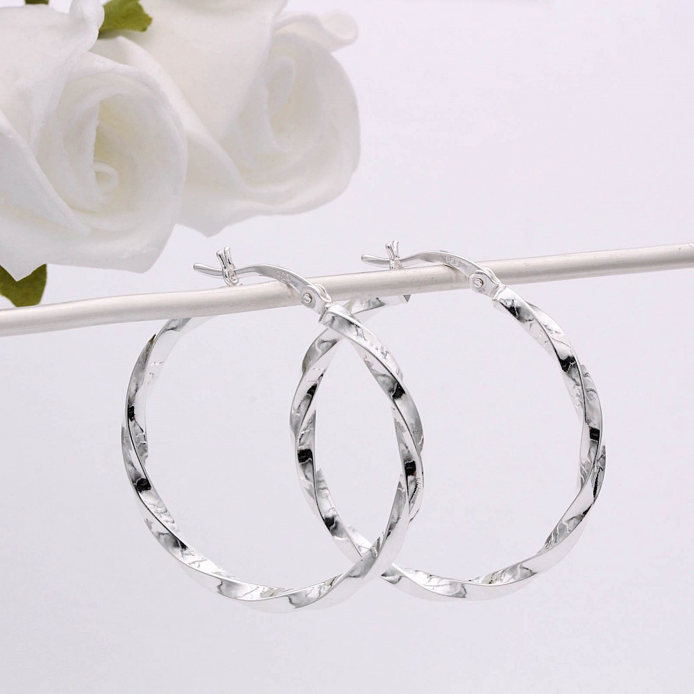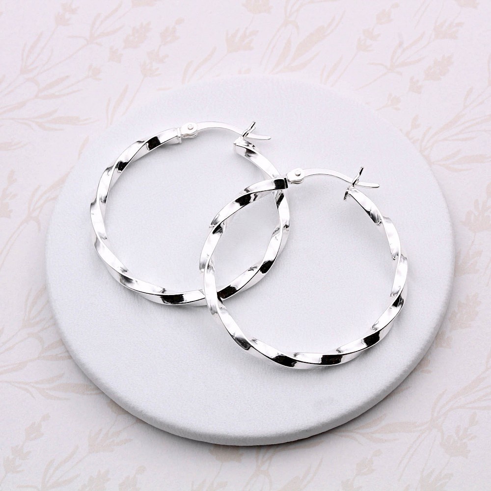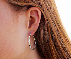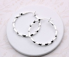 A fairly large hoop earring with a twist, a secure snap-down clasp makes these creole style Sterling Silver hoops perfect for everyday wear.