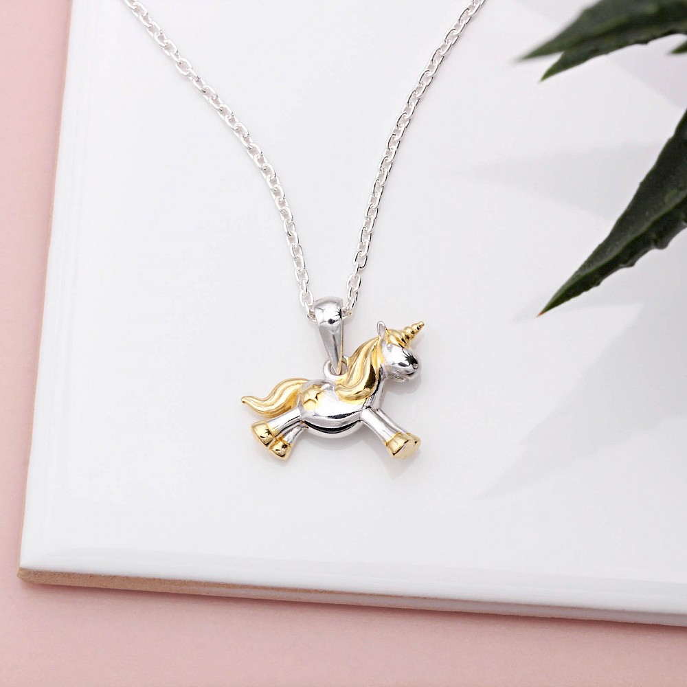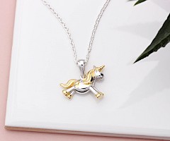 Very pretty enchanting Unicorn necklace created in Sterling Silver and 18ct Gold Vermeil. This necklace makes for a magical gift for all little princesses across the land. Matching earrings available. Also available in 18ct Rose Gold Vermeil.