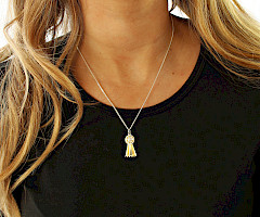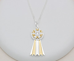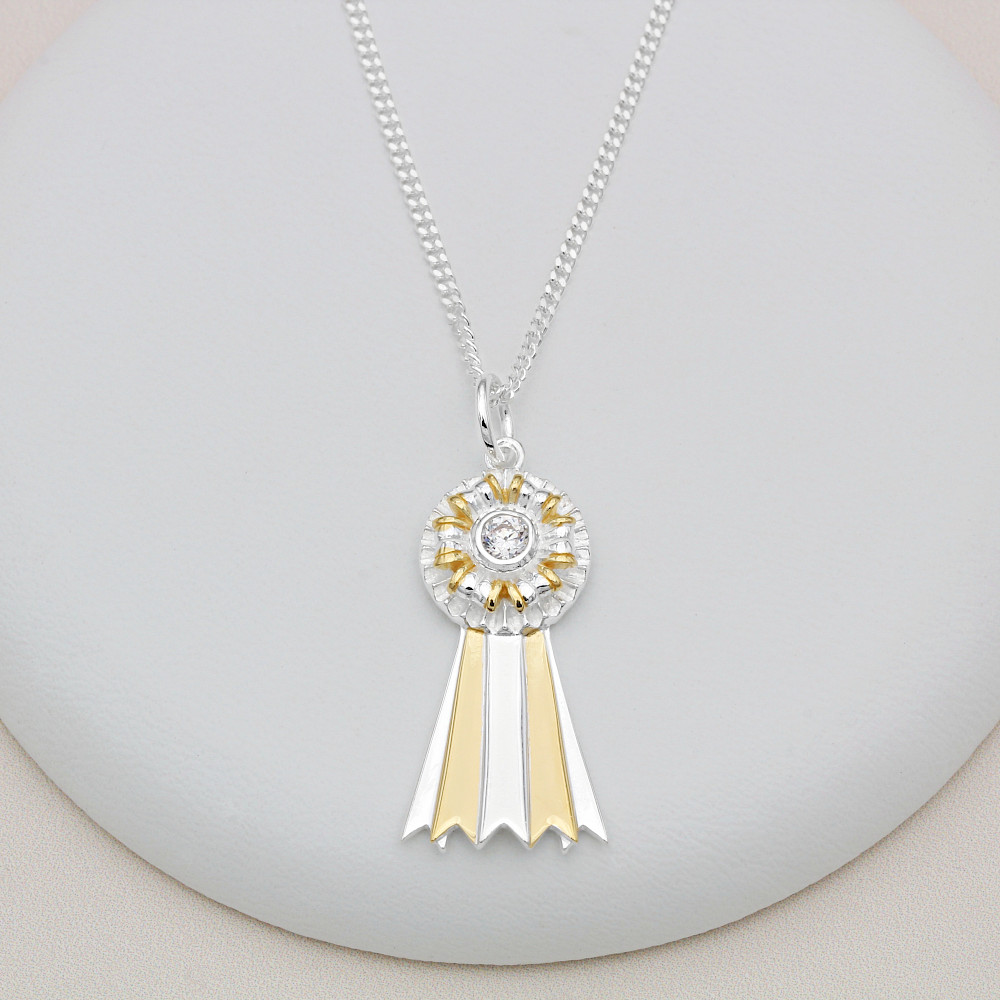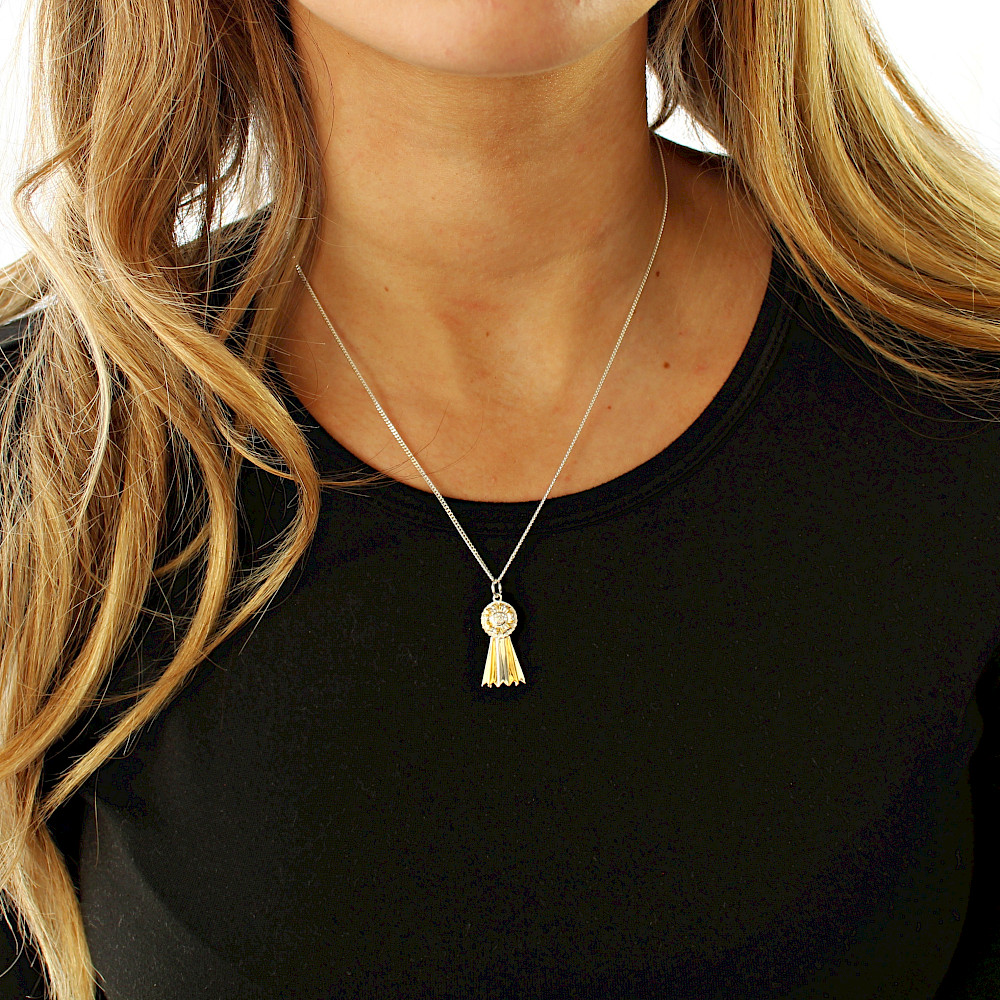 Beautifully made Sterling Silver and Gold Vermeil Rosette Necklace. Enhanced with a central cubic zirconia this two coloured rosette necklace makes an ideal gift and is sure to make the lucky recipient's face light up.