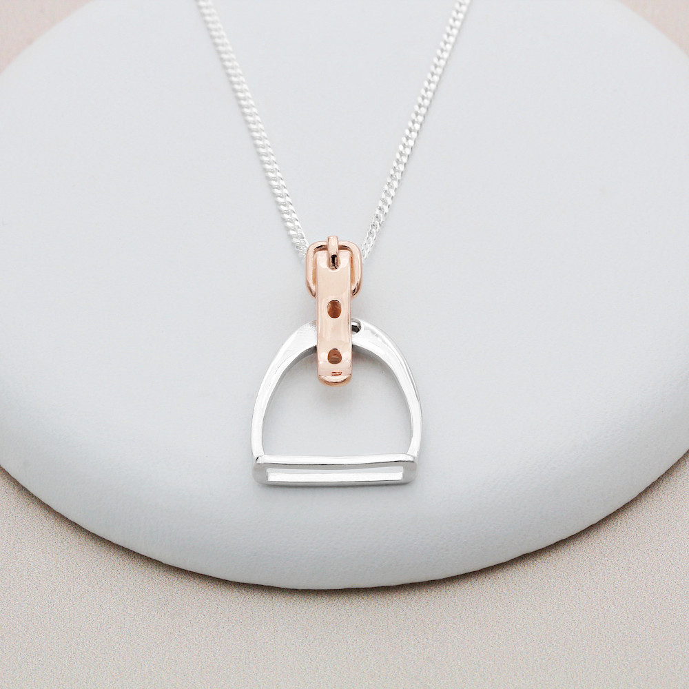 Wonderful Stirrup necklace created in Sterling Silver and enhanced with 18ct Rose Gold Vermeil. This really popular necklace has matching earrings available.