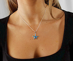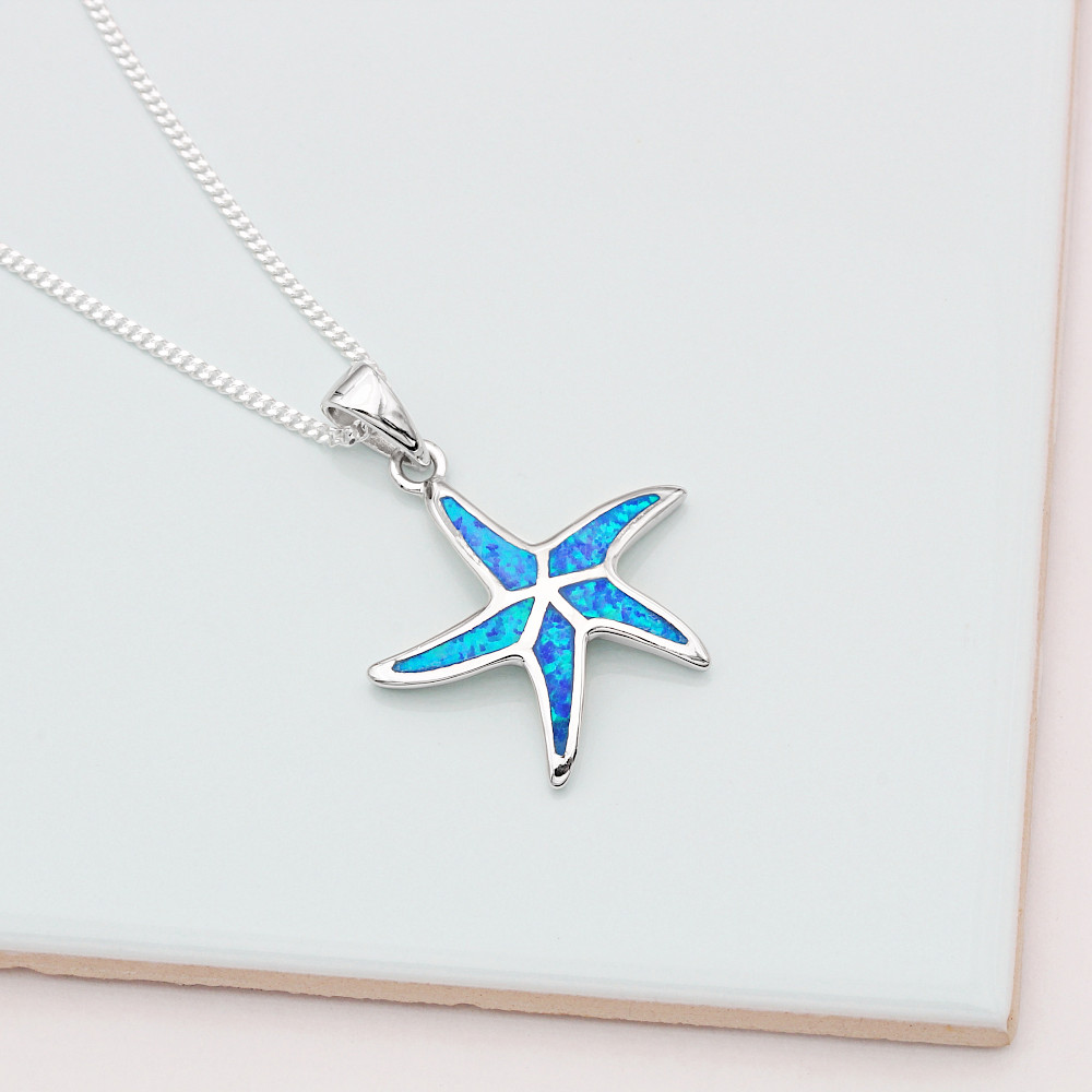 Add a little colour to your jewellery collection with this pretty Starfish necklace. Created in Sterling Silver and inlaid with opal this distinctive necklace is sure to get you noticed.
