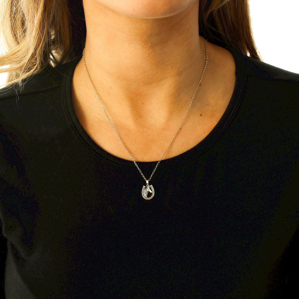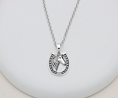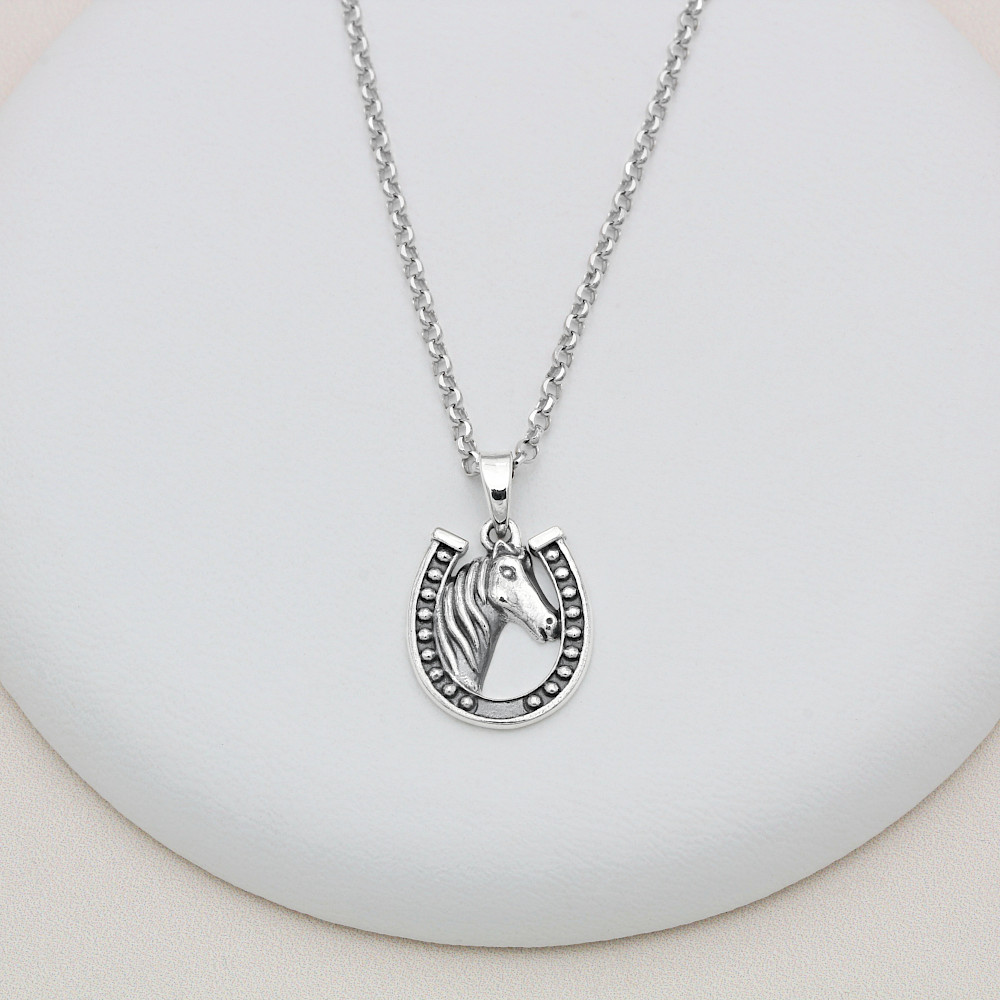 Sterling Silver Horsehead in an intricately detailed Horse Shoe. This small, neat little necklace is oxidised to enhance the beautiful detail.