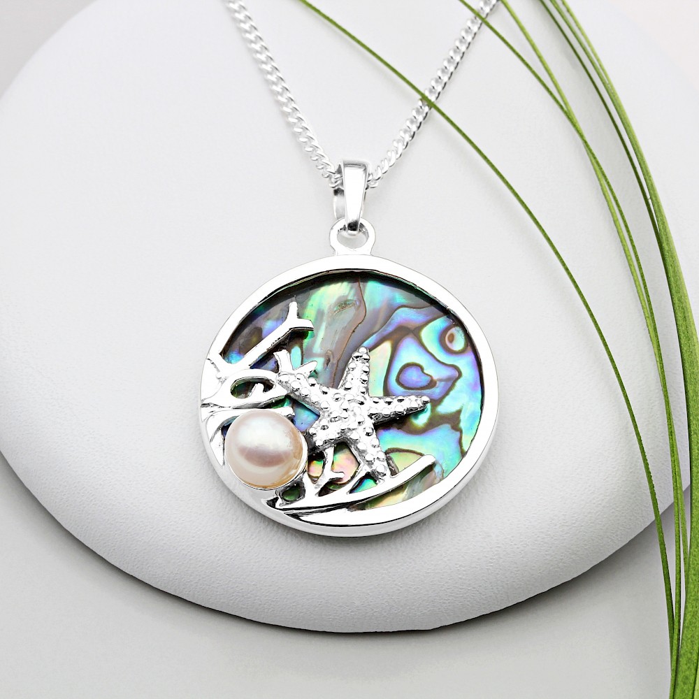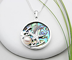 An amazing recreation of an ocean scene beautifully crafted with sterling silver and natural abalone shell. With a wonderful array of colour this unique marine life necklace is sure to complement any outfit.